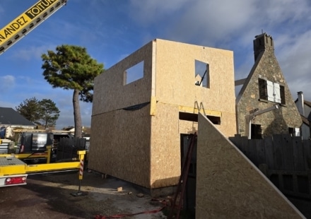 L’ossature bois repose sur une structure légère composée de montants et traverses en bois, intégrant directement l’isolation.